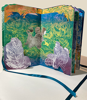 Handbound variable edition artist’s book with original woodblocks, engravings, monoprints and digital text, 2025