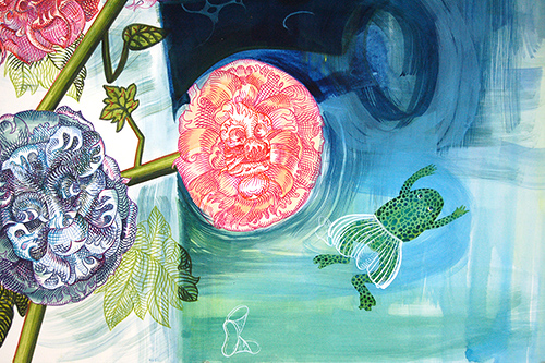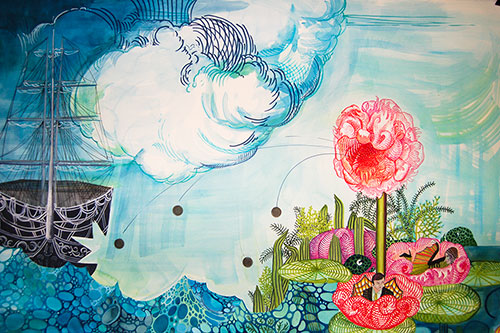An artist friend once told me I was making the biggest miniatures she’d ever seen, and this isn’t far off. The paintings hang end to end and are read as much as they are seen. Characters move through the paintings from left to right, from painting to painting. This series can be approached as a giant, flat graphic novel, but they also draw on the visual language of 14th century prints and painterly abstraction. The story is complicated and multilayered, but it’s about us, and me, and the passing of time.