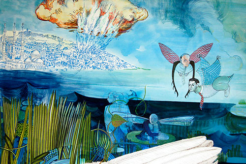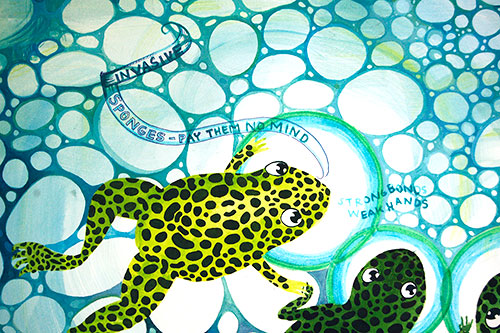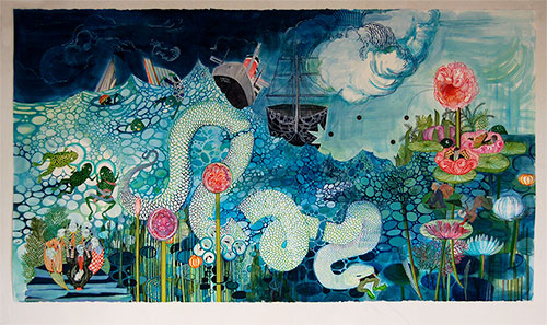 This group of huge watercolors reflects my sense of a shifting, imperiled world after the 2016 election: the narratives in the paintings are my way of working through the ways that I and the people around me responded to the increased sense of threat that some of us experienced.