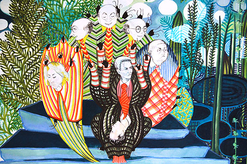 The paintings locate small individuals in a complicated metaphorical world that is populated by predators and prey, families and individuals as well as references to known political figures.